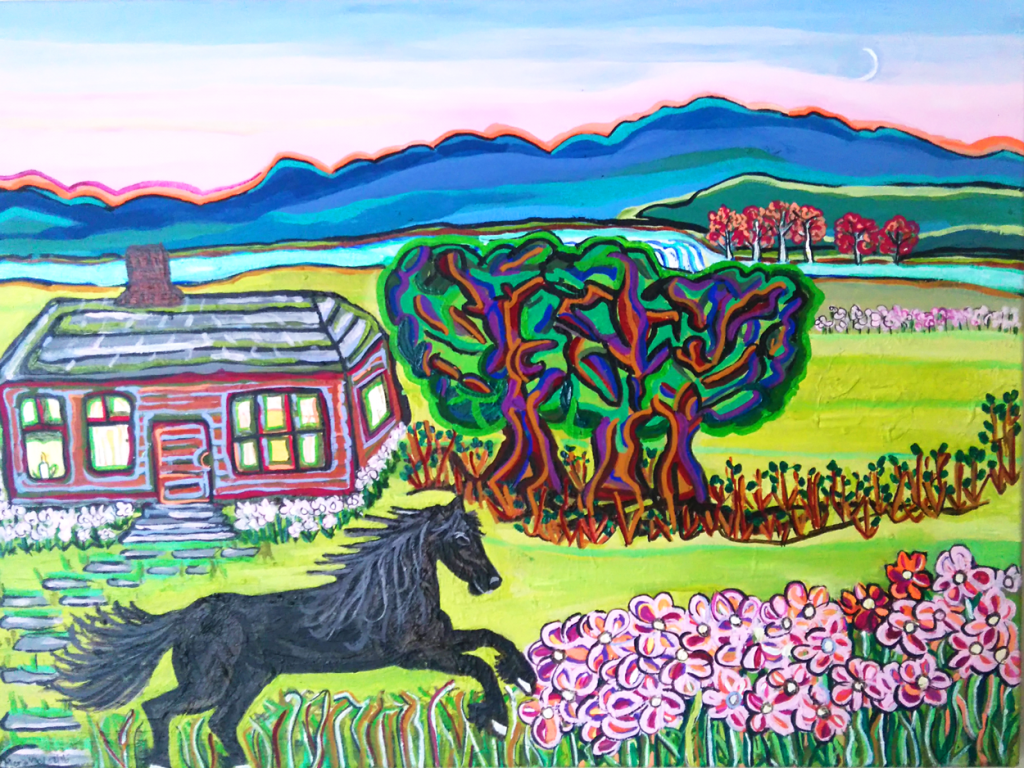 Stallion is a painting that was painted in 2015. It appears like the stallion is about to gallop through the beautiful pink flowers or is it about to rear and turn around or move onward in some other direction? I had been inspired to paint this while walking home one day. I was amazed at the beautiful sky and the sliver of moon that crept into the sky.